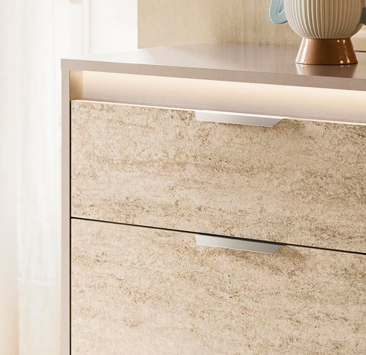 Travertine Eco-Stone drawer fronts and accents paired with Champagne High Gloss lacquer.