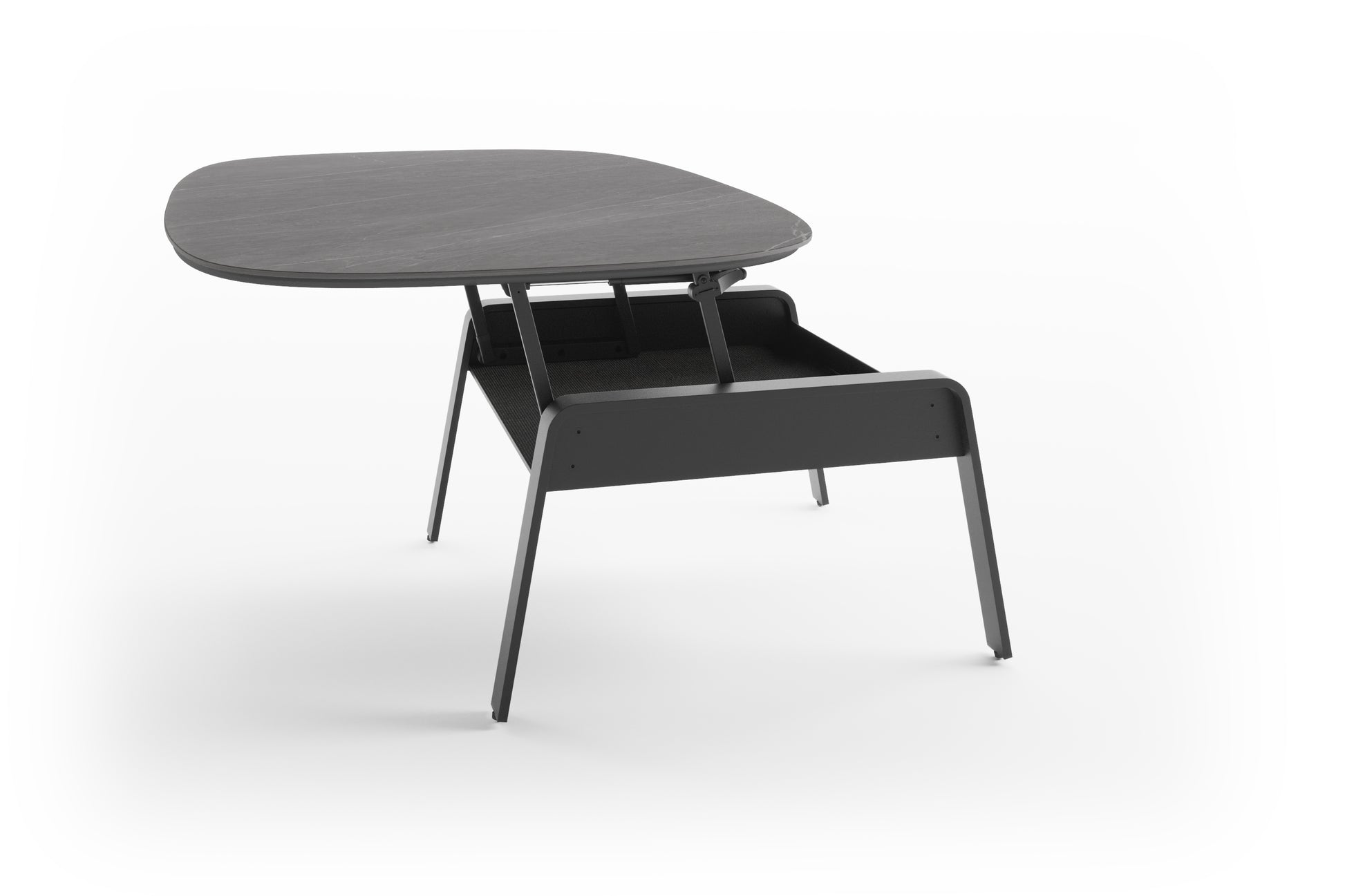 The Cloud 9 lift-top coffee table makes transitioning from work to play a dream. Smoothly gliding from its lowered position to the perfect height for work or play, Cloud 9 features a durable porcelain top that conceals a lined lower storage compartment for remotes, game controllers, and other essentials. Cloud 9 floats effortlessly on hydraulic supports to just the right height for working on a laptop or enjoying a meal on the couch, while a sturdy steel base and leveling feet provide stability on a variety of flooring. This modern and versatile coffee table is well suited for everyday use and makes a unique addition to any living space.