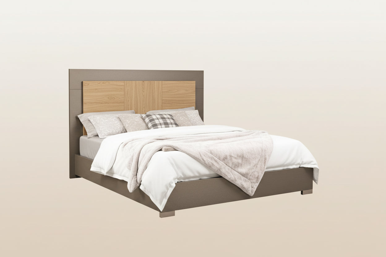The headboard of the bed, which comes in queen, king, and California sizes, is composed of overlapping walnut-finished panels. Its utility is increased with the padded headboard version and the ability to add lights, all while maintaining an eye-catching appearance.