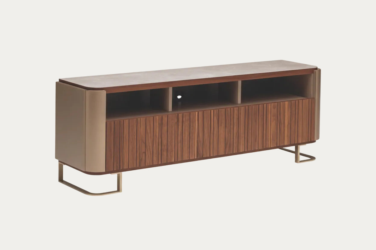 Introducing the Hera TV Stand by ALF, a masterpiece of elegance and functionality. Crafted from high-quality materials, this TV base unit is a perfect blend of style and practicality. With its harmonious combination of finishes, including a stunning golden-effect lacquered open compartment and three walnut wood drawers adorned with vertical milling, it exudes sophistication in every detail.