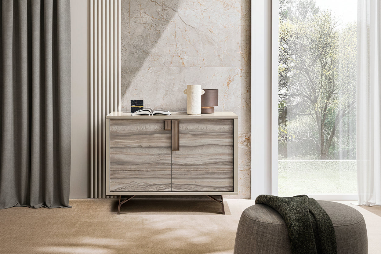 Elevate your home decor with the Jupiter 2-Door Sideboard, a masterpiece of Italian craftsmanship. Made from premium quality materials, this sideboard boasts a stunning combination of eco-stone matte and pearl line high gloss finishes. With ample storage space behind its two doors, it's perfect for decluttering your living room or dining area. Add a touch of sophistication to your home with this exquisite piece, proudly made in Italy.