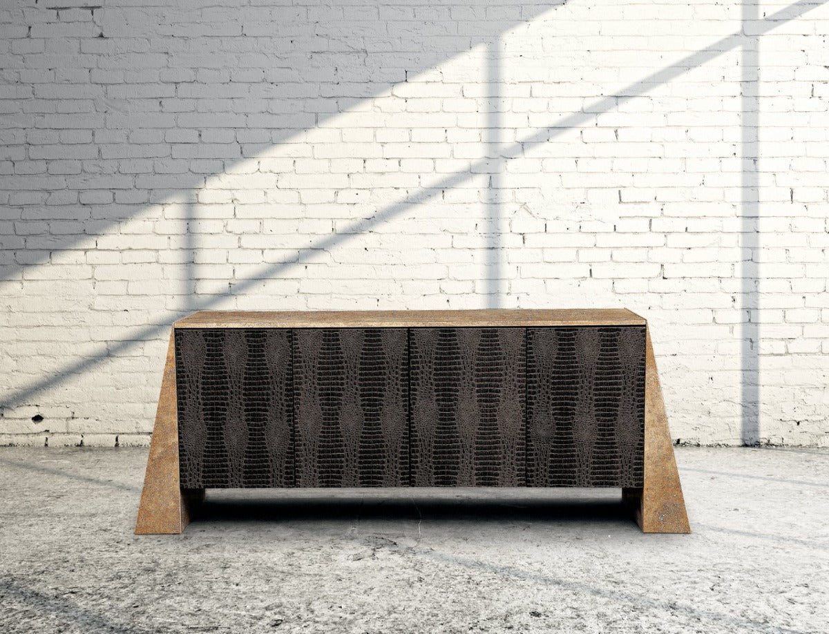 The Butterfly buffet, bold and adventurous, quickly draws your attention to the wonderfully sculpted stone sides that hoist up the credenza. The entire casing is encircled by stunning carved stone pieces. This sculpture brings drama and design into the dining room.