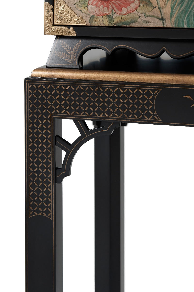 A finely hand painted and black lacquered cabinet on stand, the cabinet with gold leaf and hand painted decoration of peacocks in a landscape, with fine repousse chased brass mounts, on a base with chamfered legs and fretwork spandrels hand painted in floral and lattice decoration. The LED lit interior fitted as a bar with a mirror back and adjustable glass shelf.