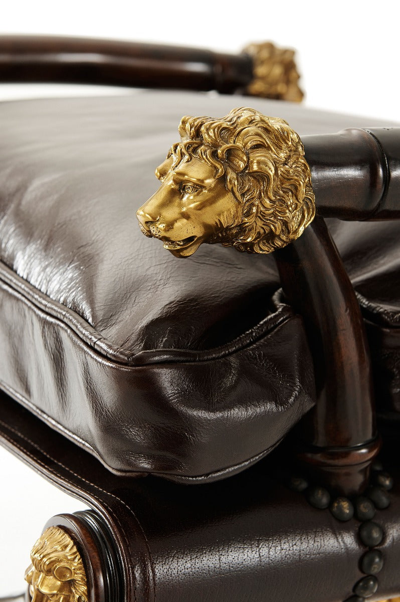 A sable mahogany and brass mounted stool in the manner of Thomas Hope, with slung seat, with lion head arm terminals, on a turned 'X' base. The original Regency.
