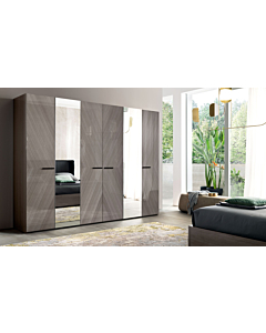 US King Bed Tempest Finish Shagreen Embossed Leather Wrapped Headboard with Downswept Wings Polished Nickel Molding Details Stepped Rail Details with Square Tapering Legs with Molding Accents